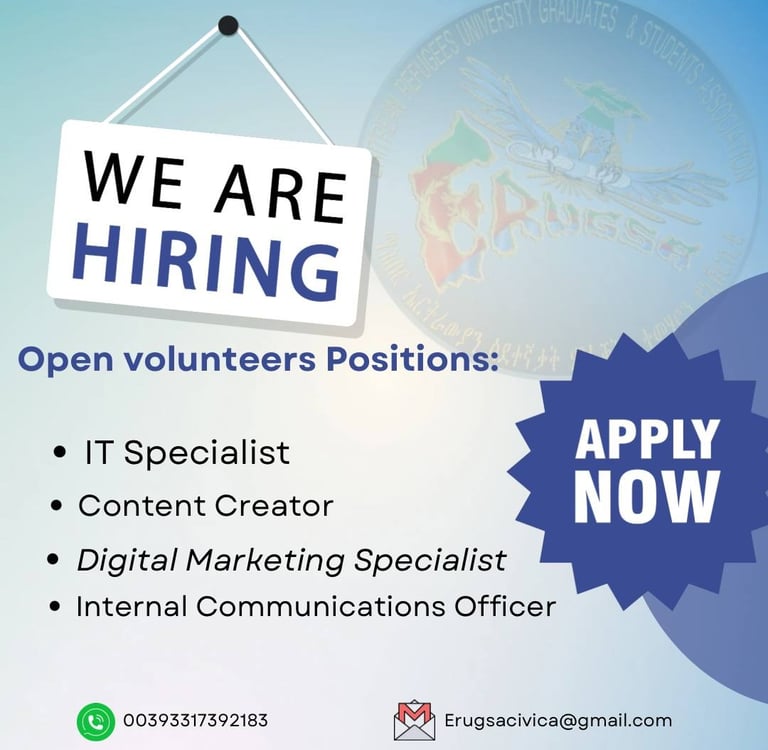 At ERUGSA, every role supports Eritrean refugees and students in accessing resources and building new lives. Volunteering here lets you gain real-world experience in PR, marketing, content creation, or IT, while connecting with like-minded people and building lasting friendships. Join us to make a meaningful impact through inclusivity and empowerment.